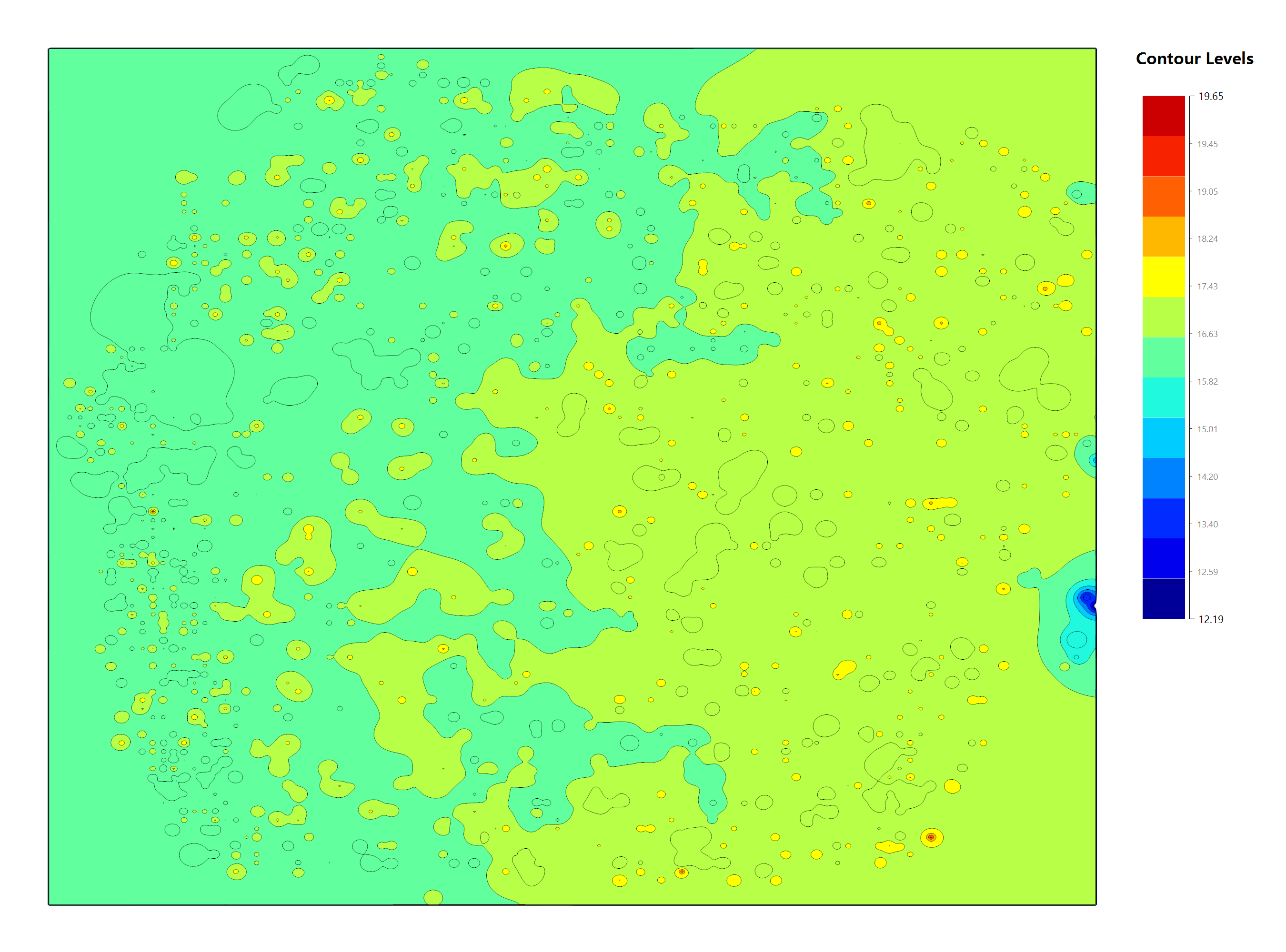 假设在一个矩形范围内,有一些离散的高度数据,形如(x, y, height)这样的数据集,通过等高线的绘制方式,我们可以得到一张这样的等高线图。