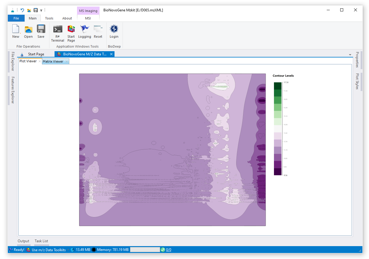 整个过程非常的简单,就只需要在原始数据文件上,通过鼠标右键,选择等高线图绘制菜单就可以完成了。一个原始数据文件的一级质谱扫描的等高线图的可视化效果是和下面类似的图像。