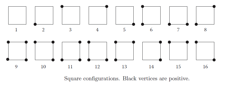 在我们所划分的网格中,每一个顶点都有一个插值过后的数值。这些数据值就是高度值,假设我们现在要画一条高度值为某一个threshold的等高线。我们可以把threshold值和网格上面的数值进行比较,大于等于该threshold值的网格顶点记为1,用实心黑点标记;反之,网格顶点为0,不标记。
