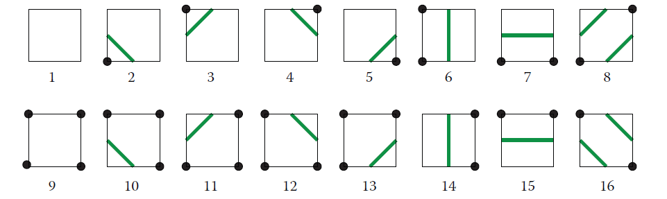 进行完顶点的标记之后,我们最后只需要进行划线,产生一个闭合的多边形,就可以得到某一个高度值对应的等高线多边形了。在我们的网格中相邻的四个顶点就是一个cell,对于每一个cell,根据顶点的标记结果,一共有2^4 = 16种情况。