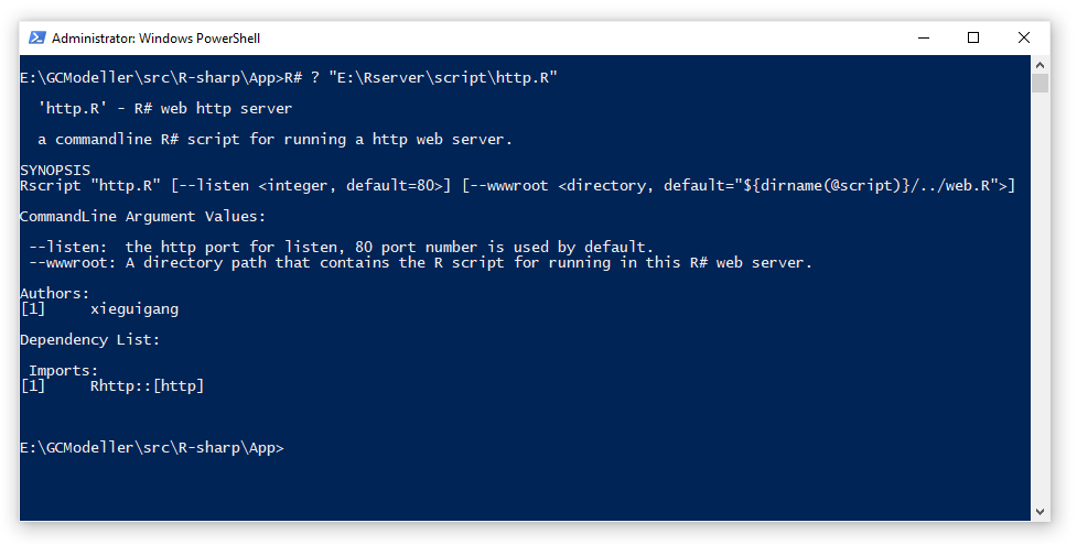 上面的完整的脚本代码,大家可以进入到Github代码库中查看:https://github.com/rsharp-lang/Rserver/blob/main/script/http.R。这个写好的R#脚本的Web服务器的命令行使用方法非常简单,我们通过R#命令查看脚本的命令行使用方法: