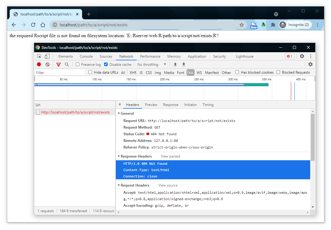 可以看到,上面的一段错误处理代码,如果我们尝试访问一个根本就不存在的R#脚本的话,错误处理代码已经正确的将错误反馈给了谷歌浏览器了。