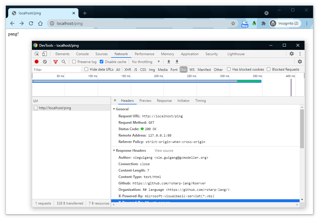 将上面的脚本代码保存在ping.R文件之中,然后启动我们的R#网页服务器。在浏览器中请求http://localhost/ping