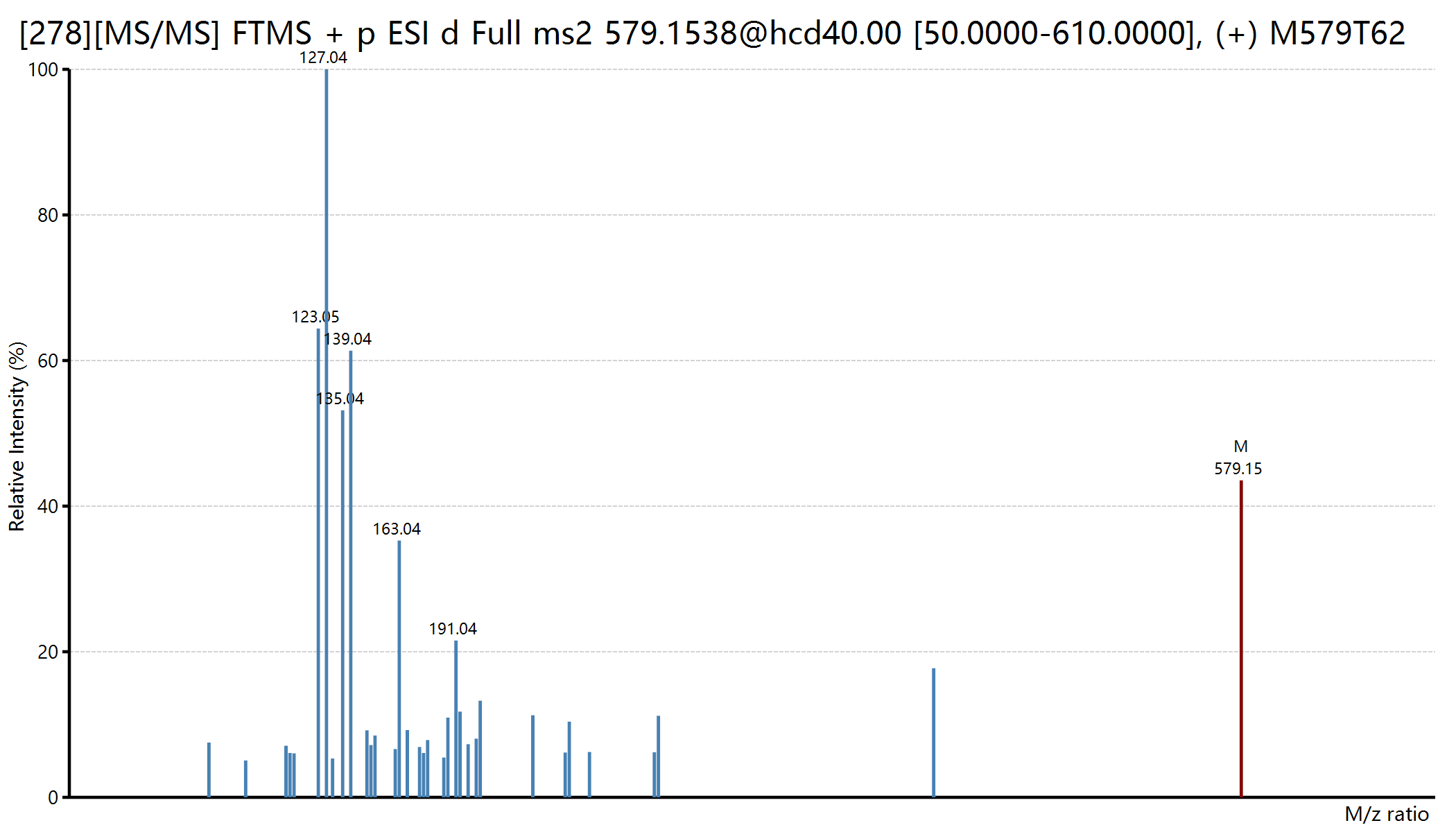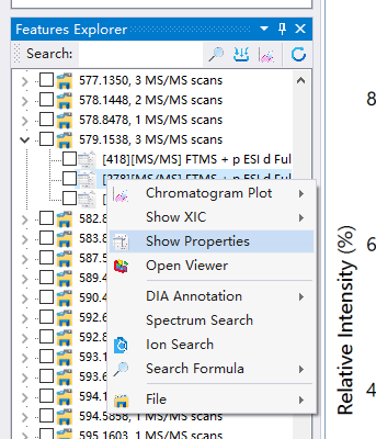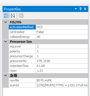 在这里,我们找到一个目标离子,然后可以通过右键菜单显示这个二级质谱图相关的属性: