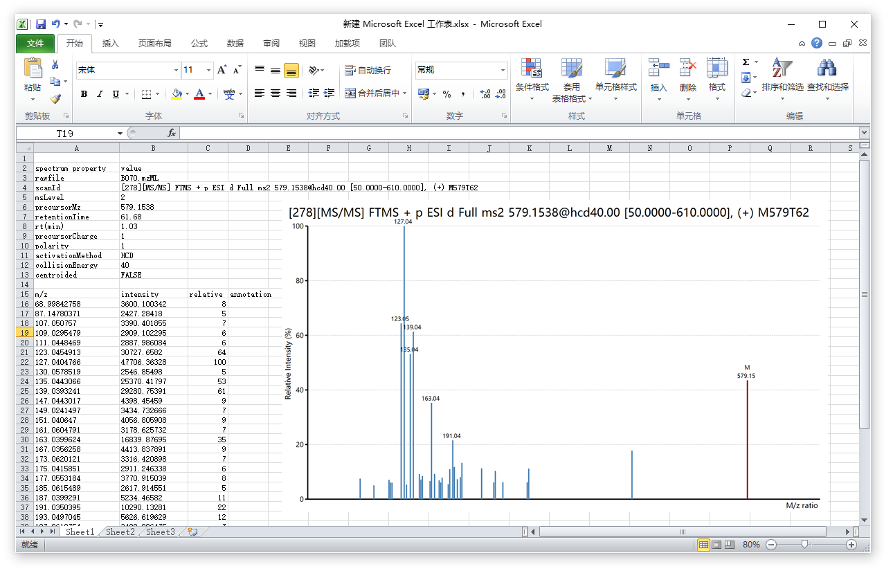 在这里展示一下通过上面的复制菜单直接复制我们的质谱数据到Excel表格中的结果: