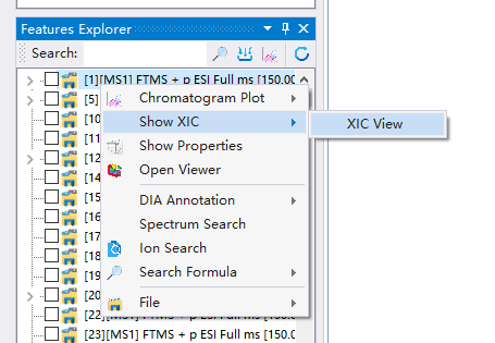 我们在文件浏览器中选中我们的目标原始数据文件之后,可以在特性浏览器【Features Explorer】中看到原始数据文件中的所有质谱扫描结果都显示出来了。在特性浏览器之中,质谱图数据默认是以扫描树的形式组织在一起的:一级扫描帧会包含有topN离子的二级扫描帧结果。接下来,我们需要通过右键菜单从扫描帧视图切换到离子列表视图。