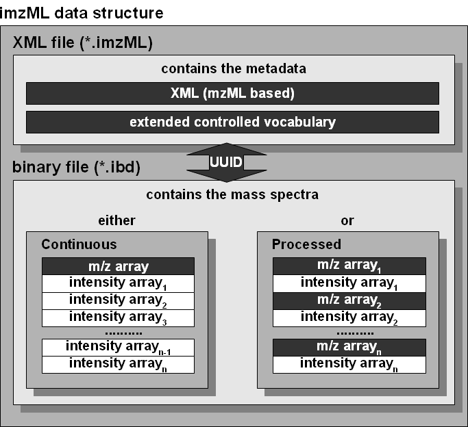 imzML主要是由两个文件构成:一个数据文件本体,也就是imzML文件了;另一部分就是一个ibd二进制文件,里面专门用于存储质谱矩阵信息。我们看imzML的文件拓展名就可以知道,imzML这个文件格式是专门应用于质谱成像领域的文件格式,因为其文件拓展名为image mzML。对于其数据文件本体而言,其就是一个没有质谱数据的mzML文件;因为其将质谱数据存放于外部的ibd二进制文件,所以读写效率要比文本文件格式的mzML文件要高很多。