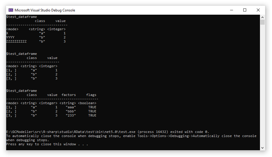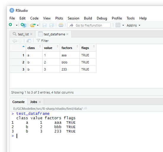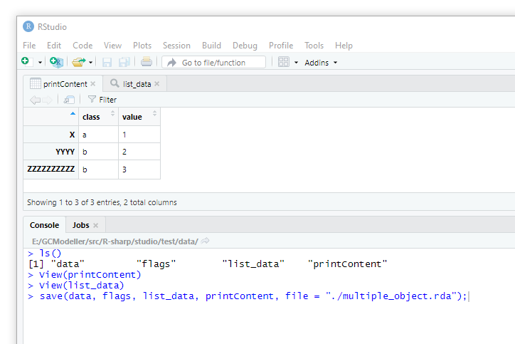 执行一下,可以看得到,在环境之中的RData数据集加载结果与R环境中的原始数据之间保持一致。R#