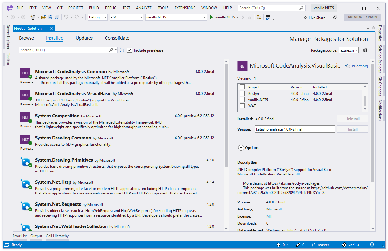 编号为Microsoft.CodeAnalysis.VisualBasic的nuget程序包是我们在这个WebAssembly编译器项目中进行VisualBasic代码的语法解析分析所必须的。而Microsoft.CodeAnalysis.Common则是对应的依赖项模块。