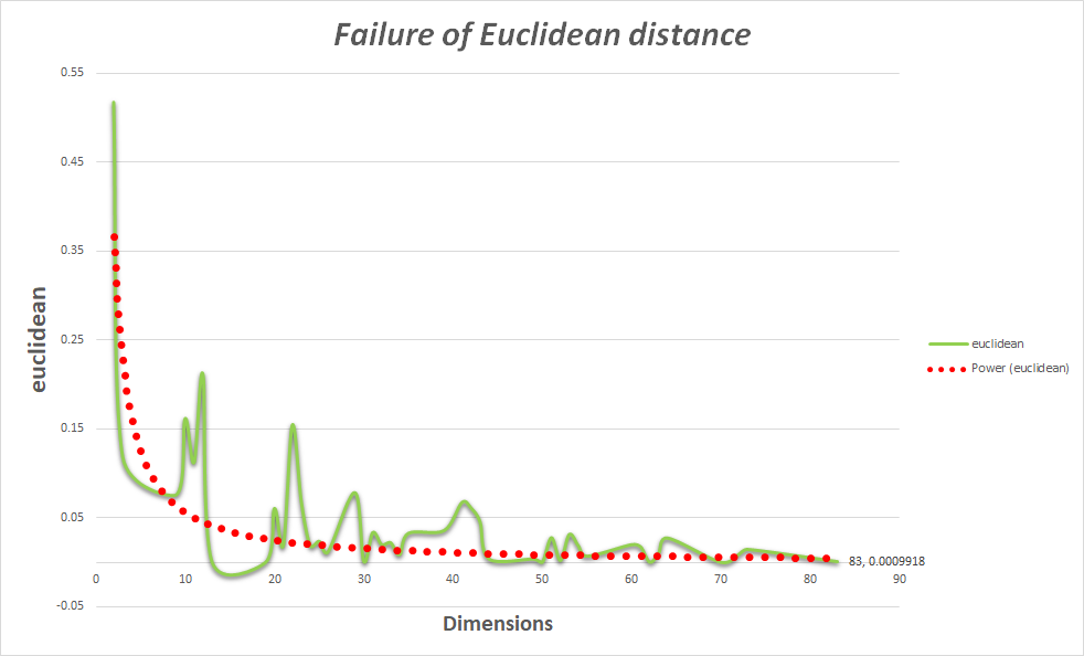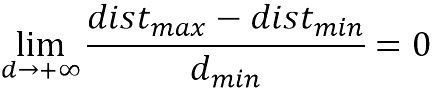 对于高维度的数据集而言,一般是包含大量零值的稀疏矩阵。即高维空间中数据样本极其稀疏。当维数很大时,独立随机变量的和在变量规模很大时,会向其期望的和收敛,就是向一个常数收敛。这个时候根据大数定理,以欧几里得距离为基础的相对对比度将会收敛于一个常数值零:
