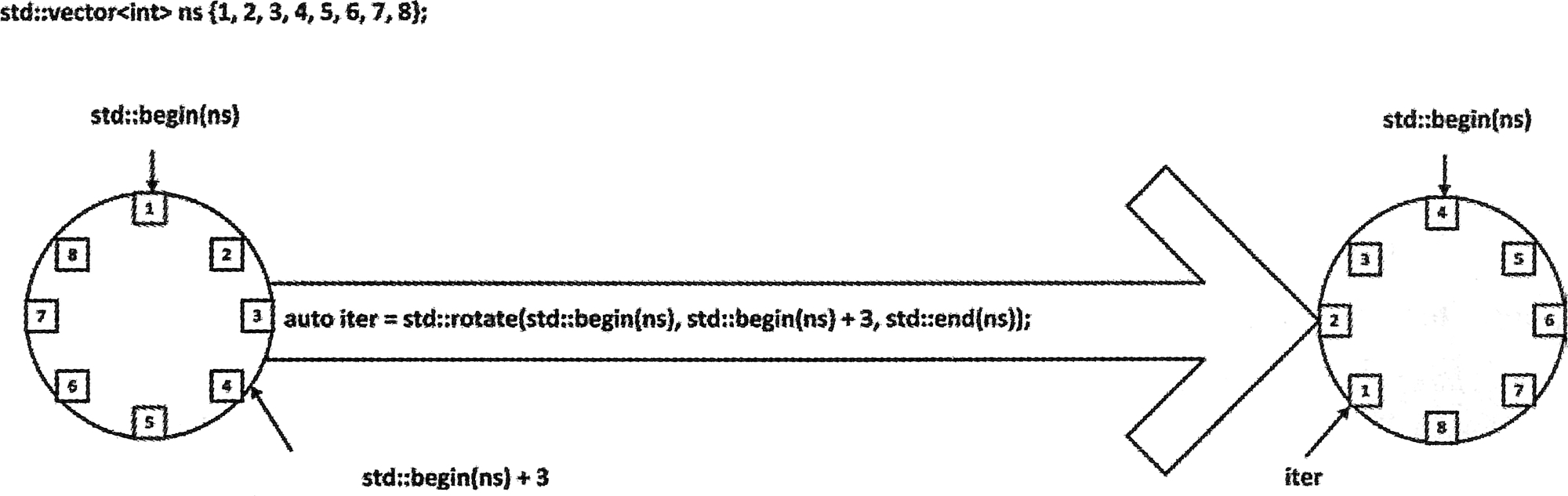 // std::rotate(iterator start, iterator middle, iterator end);