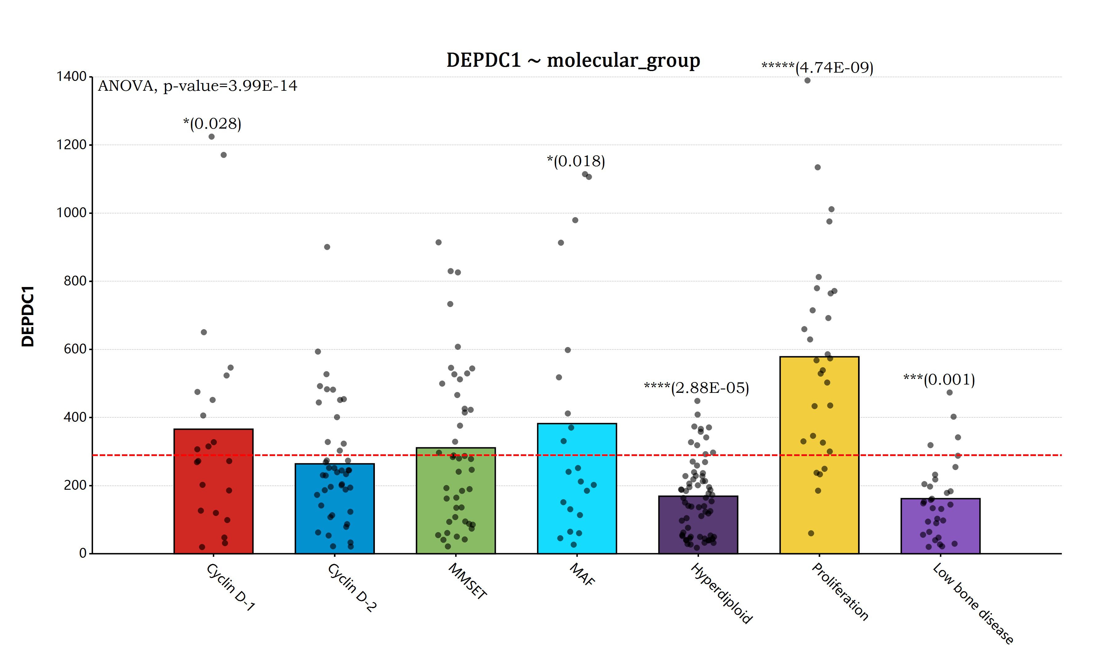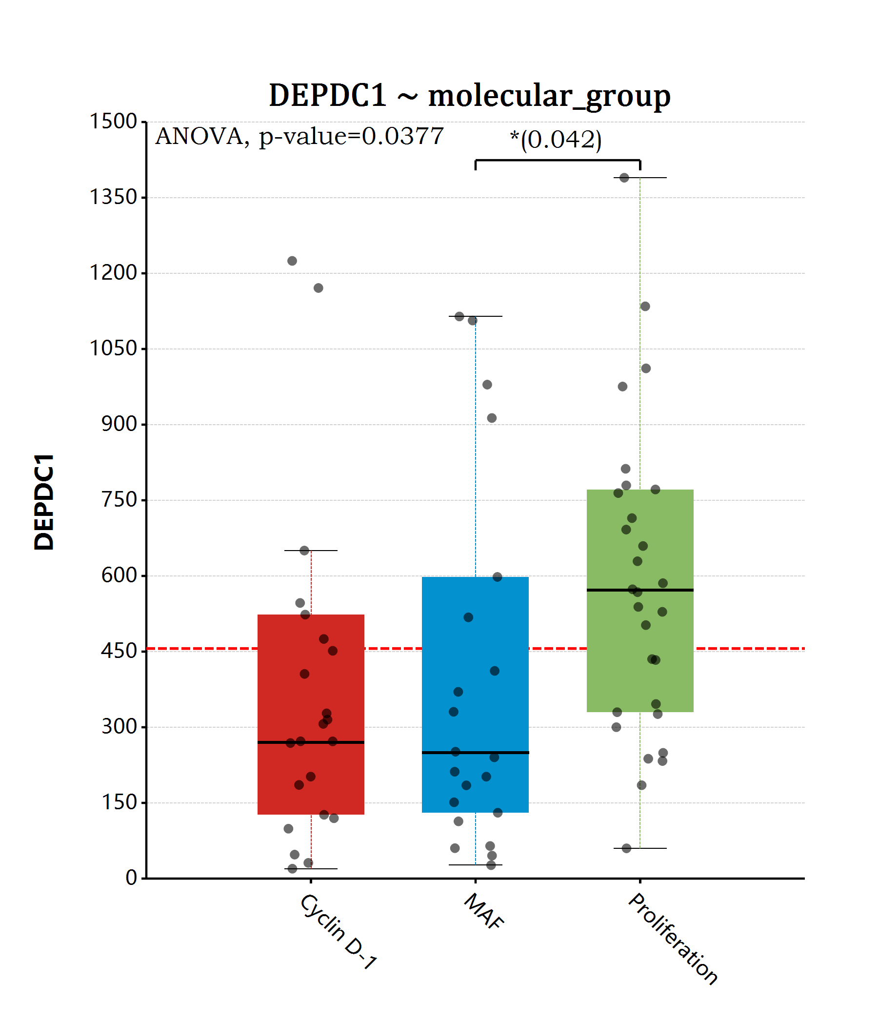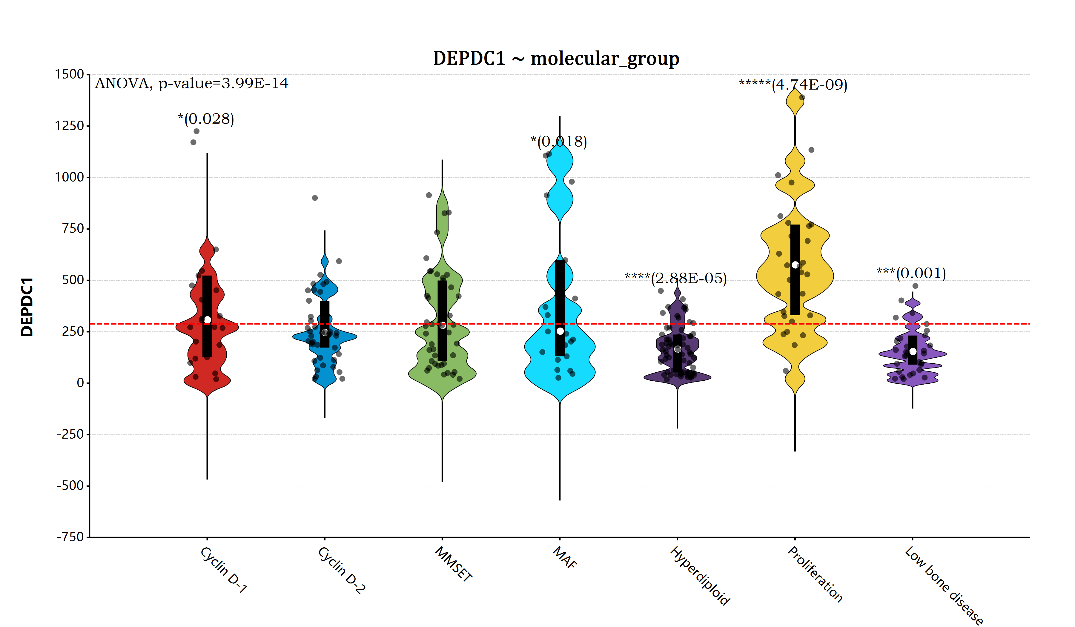 + geom_hline(yintercept = mean(myeloma$DEPDC1), linetype="dash", line.width = 6, color = "red")