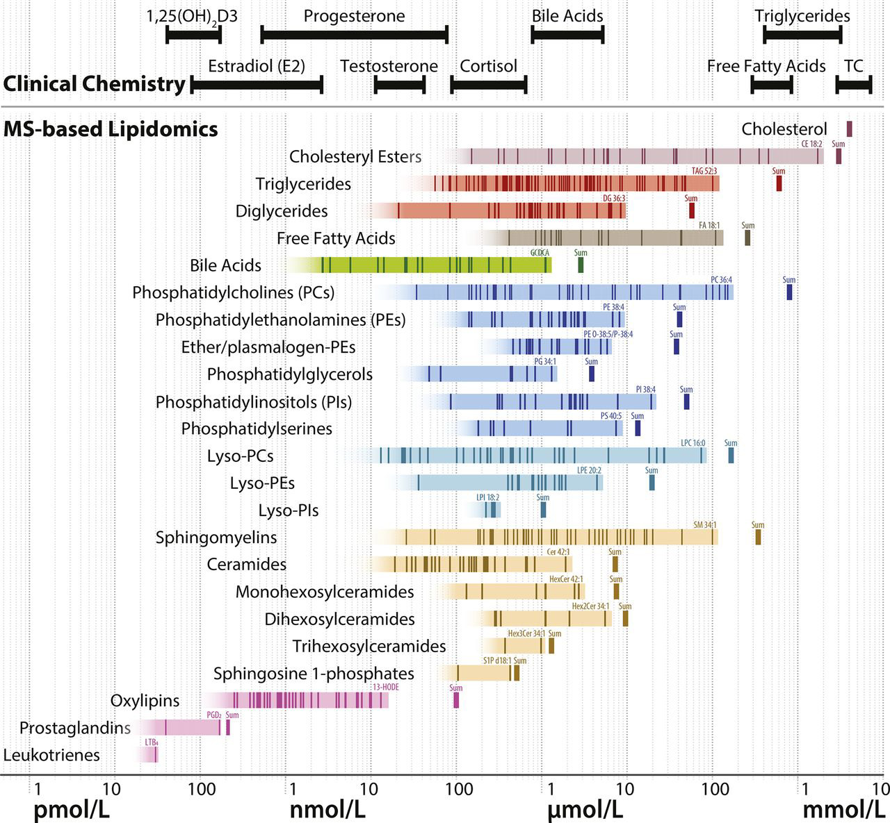 从上图的化学结构之中我们可以非常清楚地看得出来,LysoPC左边的碳链上存在有20个碳原子,并且在这条链上存在有5个双键。对于一般性的非靶向脂质代谢组学而言,由于脂质物质注释目前并没有太多的标准品数据用于比对计算分析得到注释结果,更一般的脂质注释方法一般为通过分子结构做谱图预测,基于谱图预测来完成比对注释分析。所以在脂质非靶代谢组学结果数据中,我们的脂类物质一般是可以根据母离子mz确认可能存在的化学元素组成,但是具体的分子结构在非靶脂质组学注释中并不会有太高的置信度。所以假若我们阅读基于LCMS非靶的脂质组学的文献,会发现文献中多以LysoPC(20:5)这类用于描述脂质物质的化学组成的通用名称,而非具体展开其化学结构。