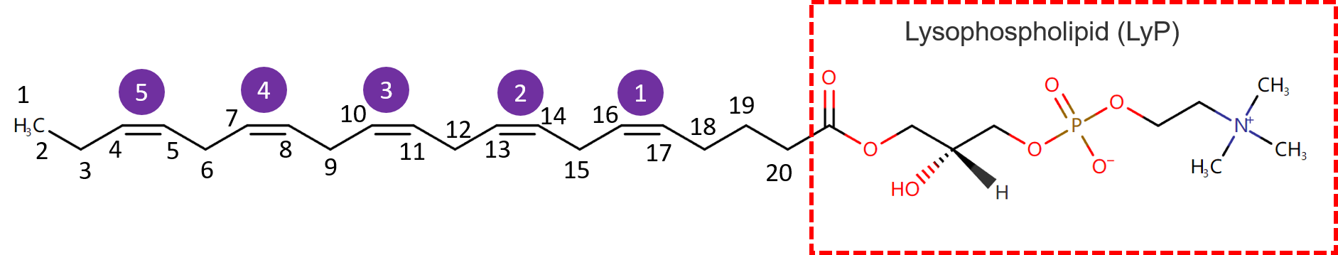 举一个实际的例子:LysoPC(20:5),从这个名字之中我们可以了解到目标脂类物质是基于LysoPC(lysophospholipid, LyP)基础框架延申出来的。其碳链为20个碳原子的链条长度,并且在其碳链上存在有5个双键。