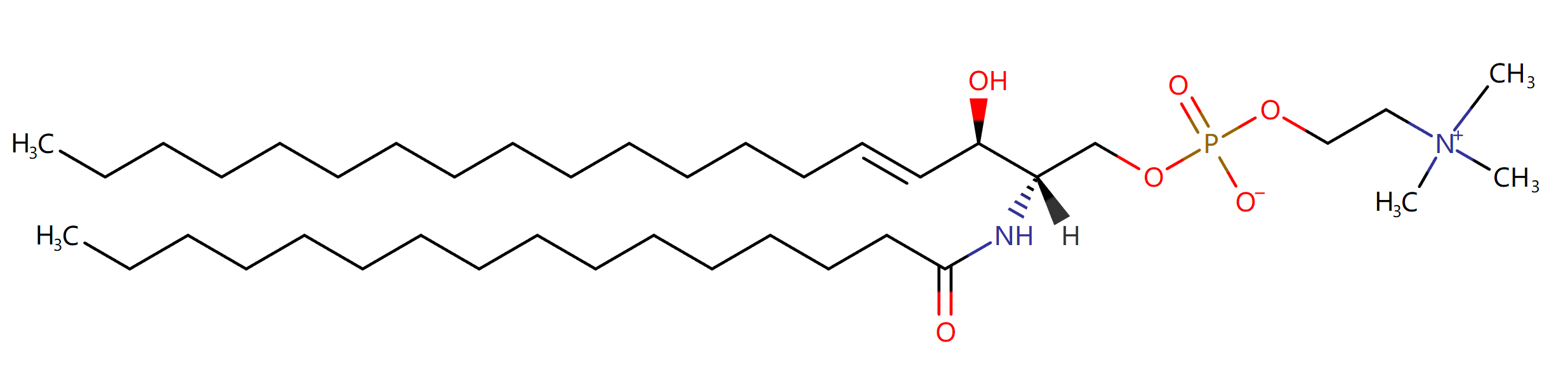 Sphingomyelin (d19:1/16:0) or SM(d19:1/16:0) is a type of sphingolipid found in animal cell membranes, especially in the membranous myelin sheath which surrounds some nerve cell axons. It usually consists of phosphorylcholine and ceramide. SM(d19:1/16:0) consists of a nonadecasphingosine backbone and a palmitic acid chain. In humans, sphingomyelin is the only membrane phospholipid not derived from glycerol. Like all sphingolipids, SM has a ceramide core (sphingosine bonded to a fatty acid via an amide linkage). In addition, it contains one polar head group, which is either phosphocholine or phosphoethanolamine. The plasma membrane of cells is highly enriched in sphingomyelin and is considered largely to be found in the exoplasmic leaflet of the cell membrane. However, there is some evidence that there may also be a sphingomyelin pool in the inner leaflet of the membrane. Moreover, neutral sphingomyelinase-2, an enzyme that breaks down sphingomyelin into ceramide, has been found to localize exclusively to the inner leaflet further suggesting that there may be sphingomyelin present there. Sphingomyelin can accumulate in a rare hereditary disease called Niemann-Pick Disease, types A and B. Niemann-Pick disease is a genetically-inherited disease caused by a deficiency in the enzyme sphingomyelinase, which causes the accumulation of sphingomyelin in spleen, liver, lungs, bone marrow, and the brain, causing irreversible neurological damage. SMs play a role in signal transduction. Sphingomyelins are synthesized by the transfer of phosphorylcholine from phosphatidylcholine to a ceramide in a reaction catalyzed by sphingomyelin synthase.