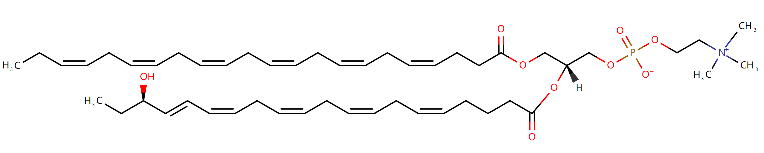 除了上面所提到的碳链之中的双键位置我们可以详细描述出来,我们也可以在脂质物质的系统命名之中添加相应的官能团的位置描述。例如下面所示的脂质物质PC(22:6(4Z,7Z,10Z,13Z,16Z,19Z)/20:5(5Z,8Z,11Z,14Z,16E)-OH(18R)),我们可以了解到: