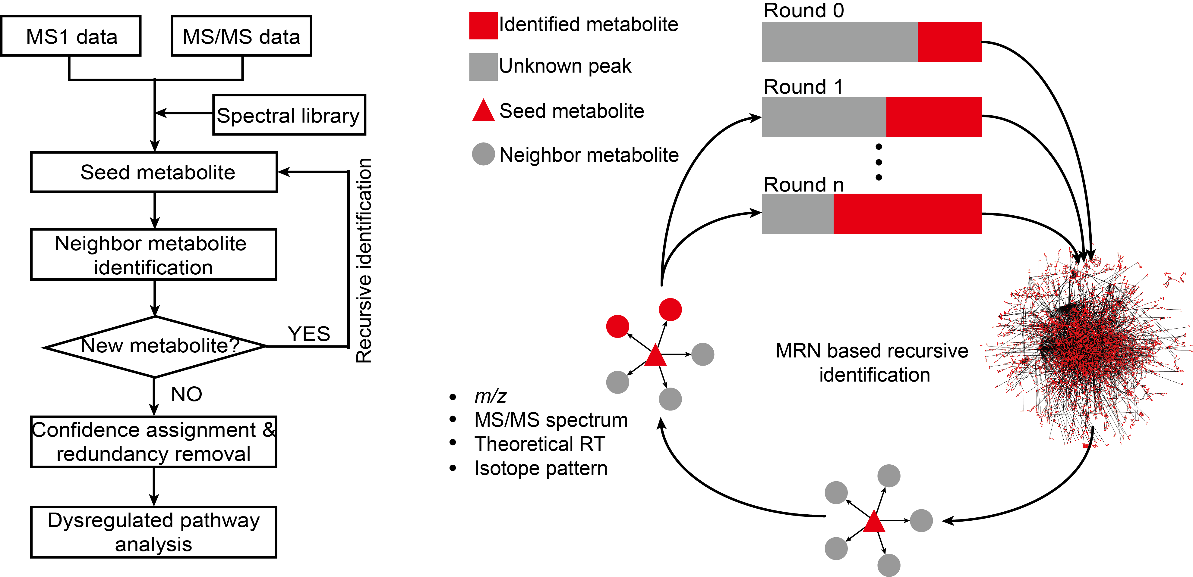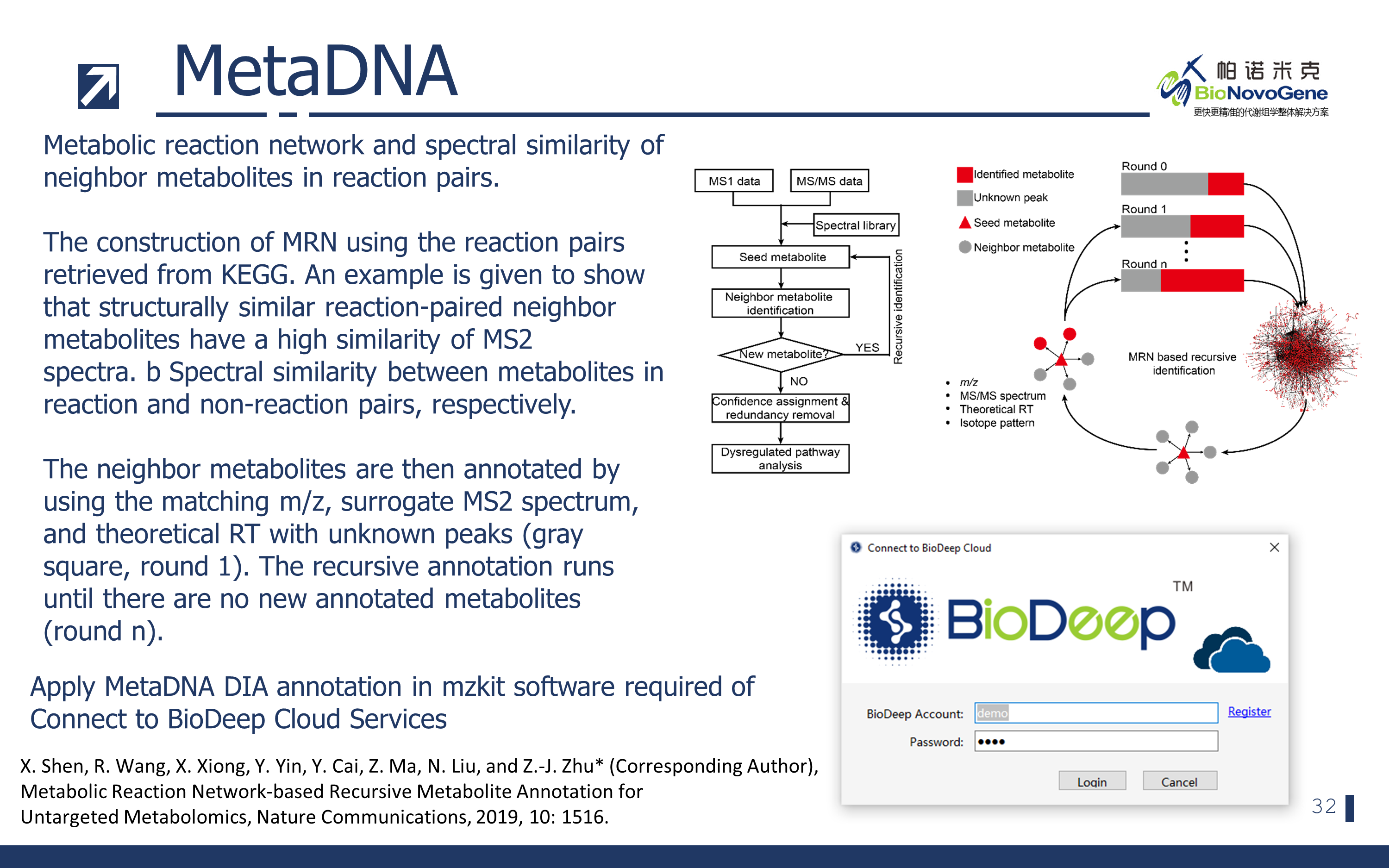 中国科学院上海有机化学研究所生物与化学交叉研究中心朱正江研究员课题组于2019年发表了一个基于KEGG代谢网络的递归式外延二级谱图注释的MetaDNA方法(metabolic reaction network (MRN)-based recursive algorithm (MetDNA))。可以有效地基于生物学上下文信息对样本之中的二级谱图数据进行推导注释。下面我们就来详细的了解一下这个方法的具体实现原理。
