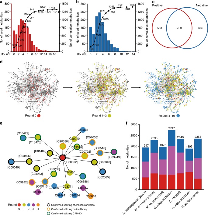 利用这个原理,MetDNA算法利用样本中已经鉴定出的代谢物作为种子,进一步鉴定代谢网络中邻近的代谢物。新鉴定出的代谢物可作为新的种子,继续鉴定代谢网络中邻近代谢物,递归运算,直到不再能够鉴定出新的邻近代谢物。该算法的最大特点是可以通过代谢反应网络去鉴定没有标准MS/MS谱图的代谢物,使得代谢物的结构鉴定并不依赖很大规模的标准MS/MS数据库。