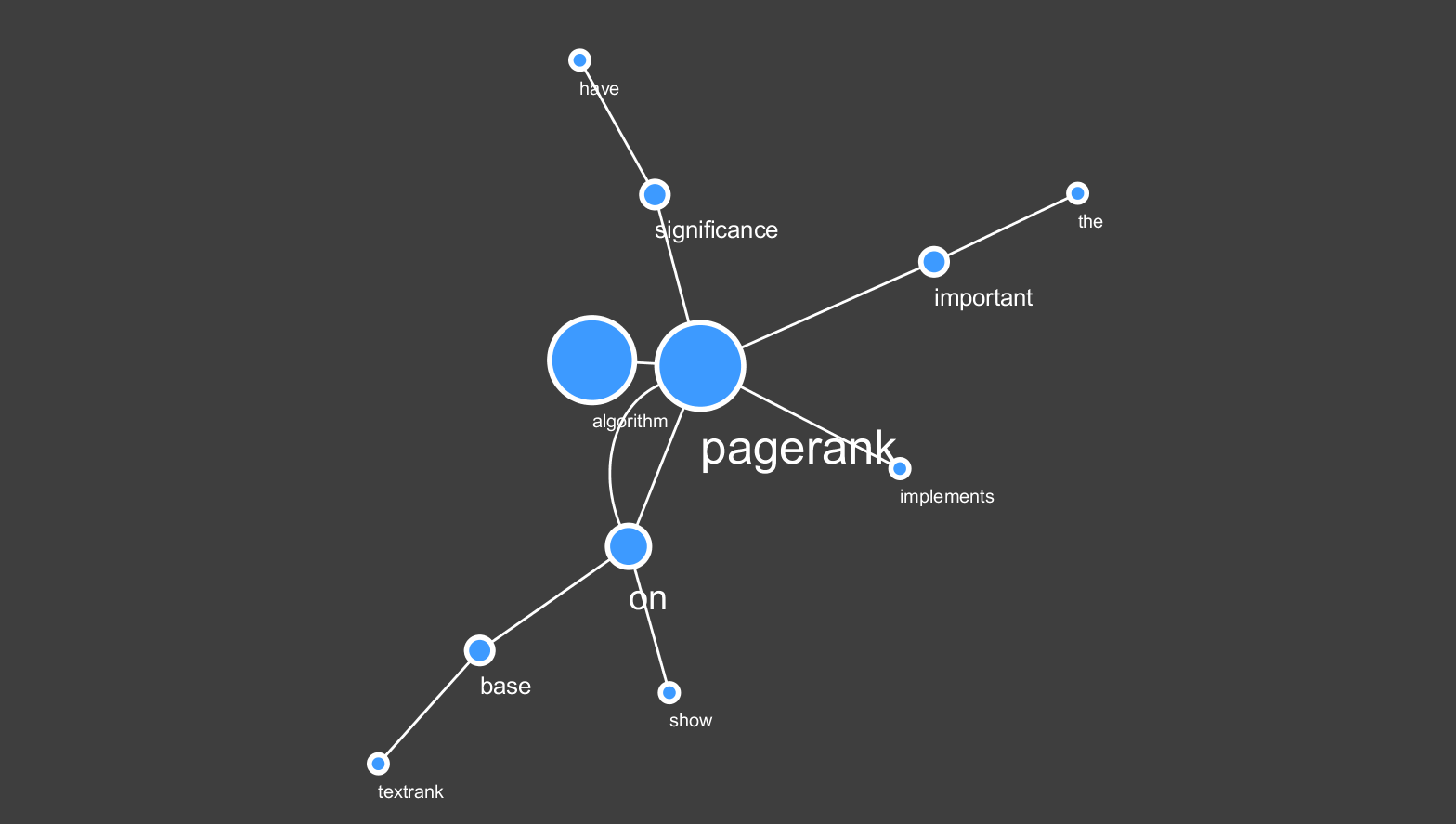 - 接着我们就可以在分词结果的基础上进行图对象的构建了:在图对象里面,都是存在有节点和节点之间的边连接关系这两种类型的数据组成的。在我们前面所分词处理后的文本数据中,所分出来的每一个单词实际上都相当于图对象之中的节点对象;那么,这个时候,源文本中的前一个单词和后一个单词二者之间就可以添加一条边连接。通过单词和单词之间的前后链接关系我们就可以将任意一个文本数据转换为基于单词节点的图对象了
