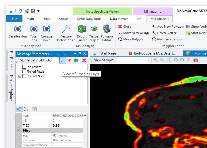 如果需要进行单个离子的质谱成像,我们只需要在【MSImaging Parameters】窗口的输入栏中填入我们的目标离子的m/z值,然后点击输入框旁边的放大镜按钮即可查看目标的质谱成像图。例如我们想要查看m/z值为643.0663的代谢物离子的成像图,则可以按照下面的简单步骤进行成像操作: