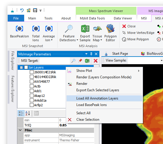 1. 在完成了10x的h5ad原始数据文件导入操作之后,在【MSI Parameters】窗口之中,通过鼠标右键菜单【Load All Annotation Layers】操作加载基因注释列表