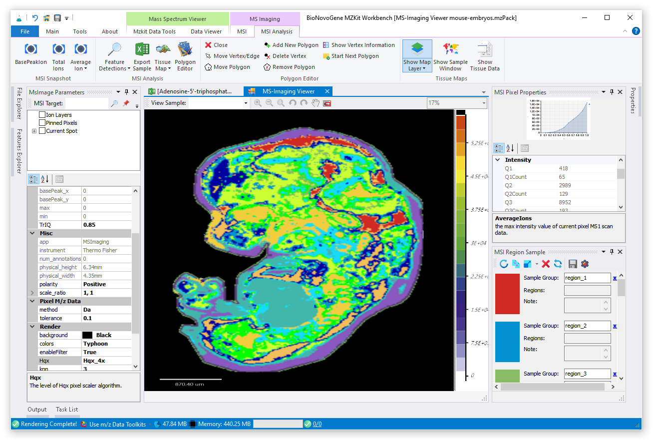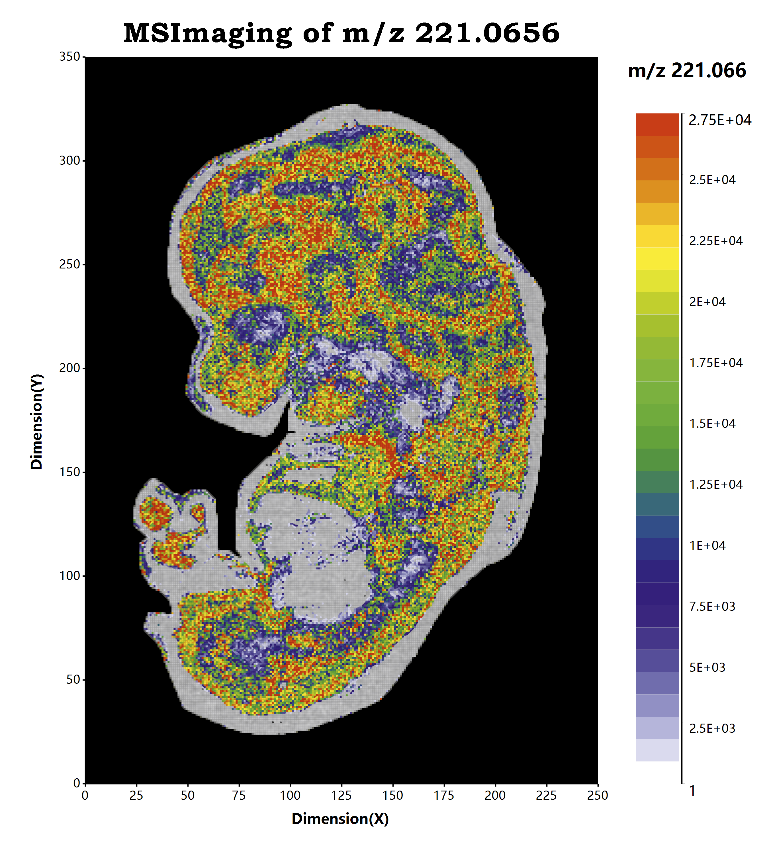 对于质谱成像可视化而言,其就是一个热图的绘制过程:我们将一定的离子图层信息提取出来,根据所提取的离子图层的信号响应度信息进行线性变换,映射到对应的颜色上,然后吧颜色显示到对应的空间坐标位置,就可以通过热图的方式吧我们的生物样本可视化出来了。在MZKit工作站软件之中,可以非常简单的进行单个离子的质谱成像,以及多个离子的质谱成像查看。