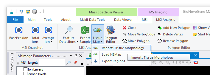 1. 顶部菜单栏,主要有两大部分组成:【MSI】和【MSI Analysis】,其中第一组【MSI】菜单主要是应用于质谱成像原始数据文件的处理操作,例如:文件导入操作,文件导出操作,文件合并操作,文件数据旋转操作,质谱成像效果调整等操作;而第二组菜单主要是应用于质谱成像数据的一些简单分析处理操作,例如:获取文件中的离子特征列表,样本手动分区,导入和导出样本分区文件等基础的数据操作功能。