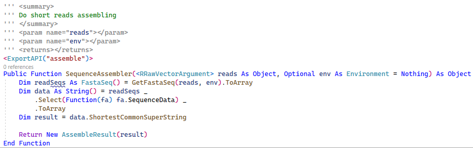 使用VB.NET将SCS算法封装成了一个函数用于javascript外部调用,下面的一段javascript代码展示了基于算法进行短reads组装的简单实现:SCS