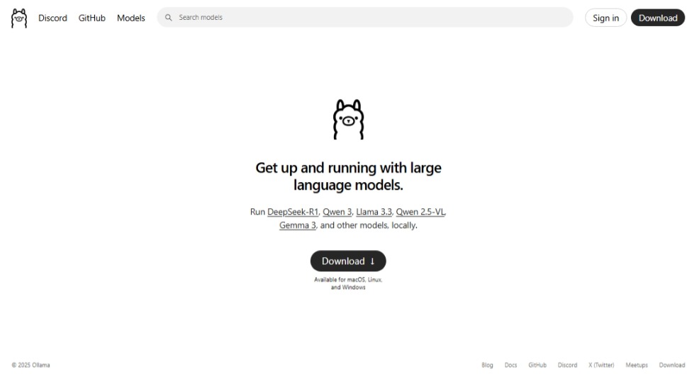 通过ollama在我们的本地电脑上(或者本地服务器上)部署一个大语言模型非常的简单,我们首先需要上到ollama的官网(https://ollama.com/)上,直接在主页上就可以看到Ollama的下载链接了。