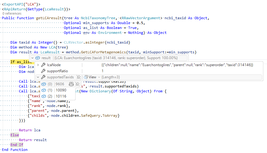 将上面所描述的LCA算法导出为GCModeller程序中的一个工具函数后,我们就可以在R#脚本语言中进行相关的LCA祖先节点的计算,下面为一个demo脚本: